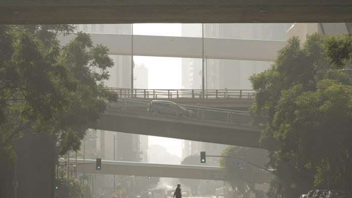 A person crosses a street as smog fills the air Wednesday, Dec. 4, 2024, in Los Angeles.